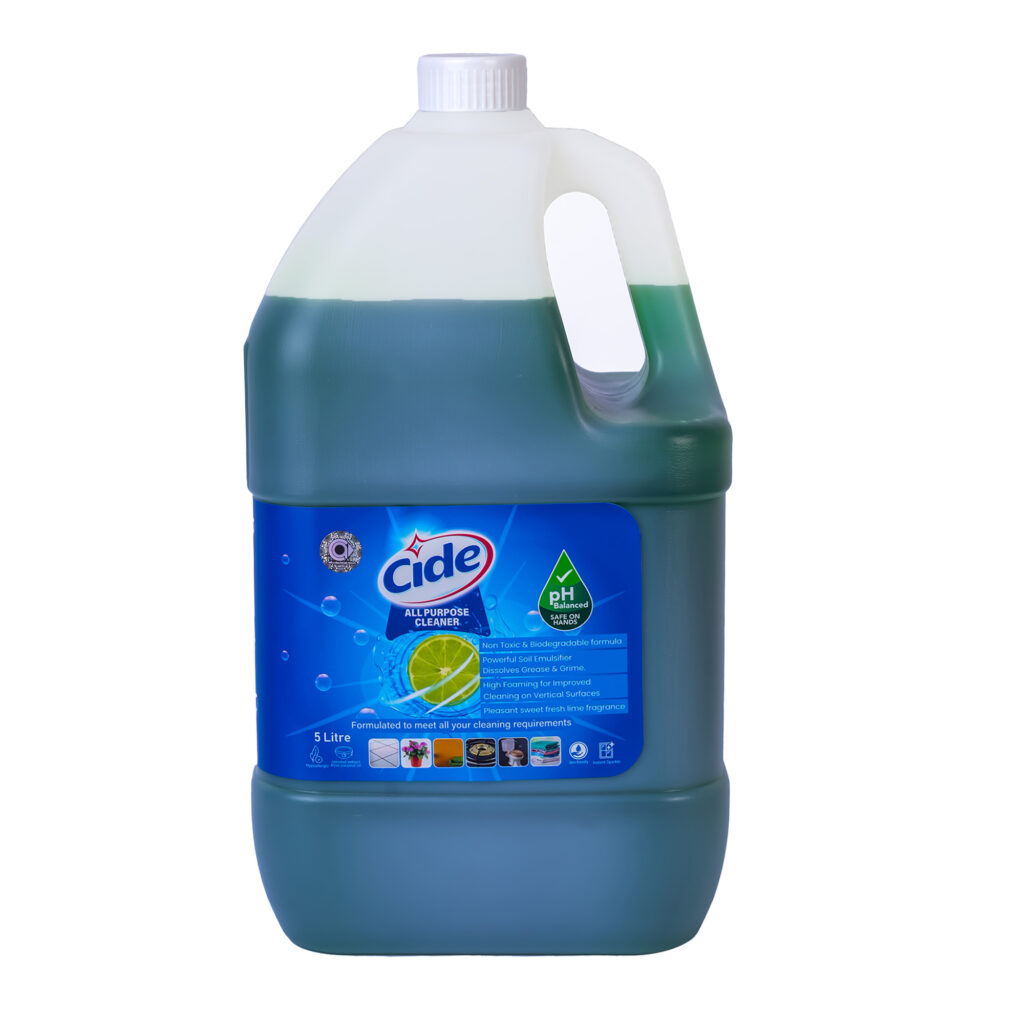 Cide All Purpose Cleaner Lime, your ultimate solution for a sparkling clean environment. With its powerful formula and refreshing lime scent, this 5-liter bottle is designed to meet all your cleaning requirements with ease. Versatile and efficient, CIDE All Purpose Cleaner Lime tackles dirt, grime, and grease on various surfaces, making it ideal for use in homes, offices, schools, and more. From kitchen countertops to bathroom tiles, this cleaner delivers exceptional results, leaving your surfaces spotless and shining. Formulated with advanced cleaning agents, CIDE All Purpose Cleaner Lime ensures maximum effectiveness, saving you valuable time and effort. Its lime-infused formula not only provides a pleasant aroma but also helps neutralize odors, leaving your space smelling fresh and inviting. With a generous 5-liter capacity, this bottle offers long-lasting cleaning power, making it suitable for larger cleaning tasks or frequent use. The convenient handle and easy-pour design allow for effortless dispensing, ensuring a hassle-free cleaning experience. CIDE All Purpose Cleaner Lime is also designed with your safety in mind. It is made from high-quality ingredients that are non-toxic and environmentally friendly, making it a reliable choice for a healthier cleaning routine. Plus, its non-abrasive nature ensures that it won’t damage delicate surfaces, preserving their beauty and longevity. When it comes to meeting all your cleaning needs, CIDE All Purpose Cleaner Lime is the perfect choice. Bring home this 5-liter bottle today and enjoy a clean and fresh environment that shines with brilliance.